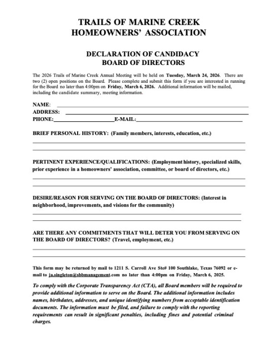 The Board of Directors of Trails of Marine Creek Homeowners Association, Inc. is now accepting candidates for election to the Board at the upcoming Annual Meeting.